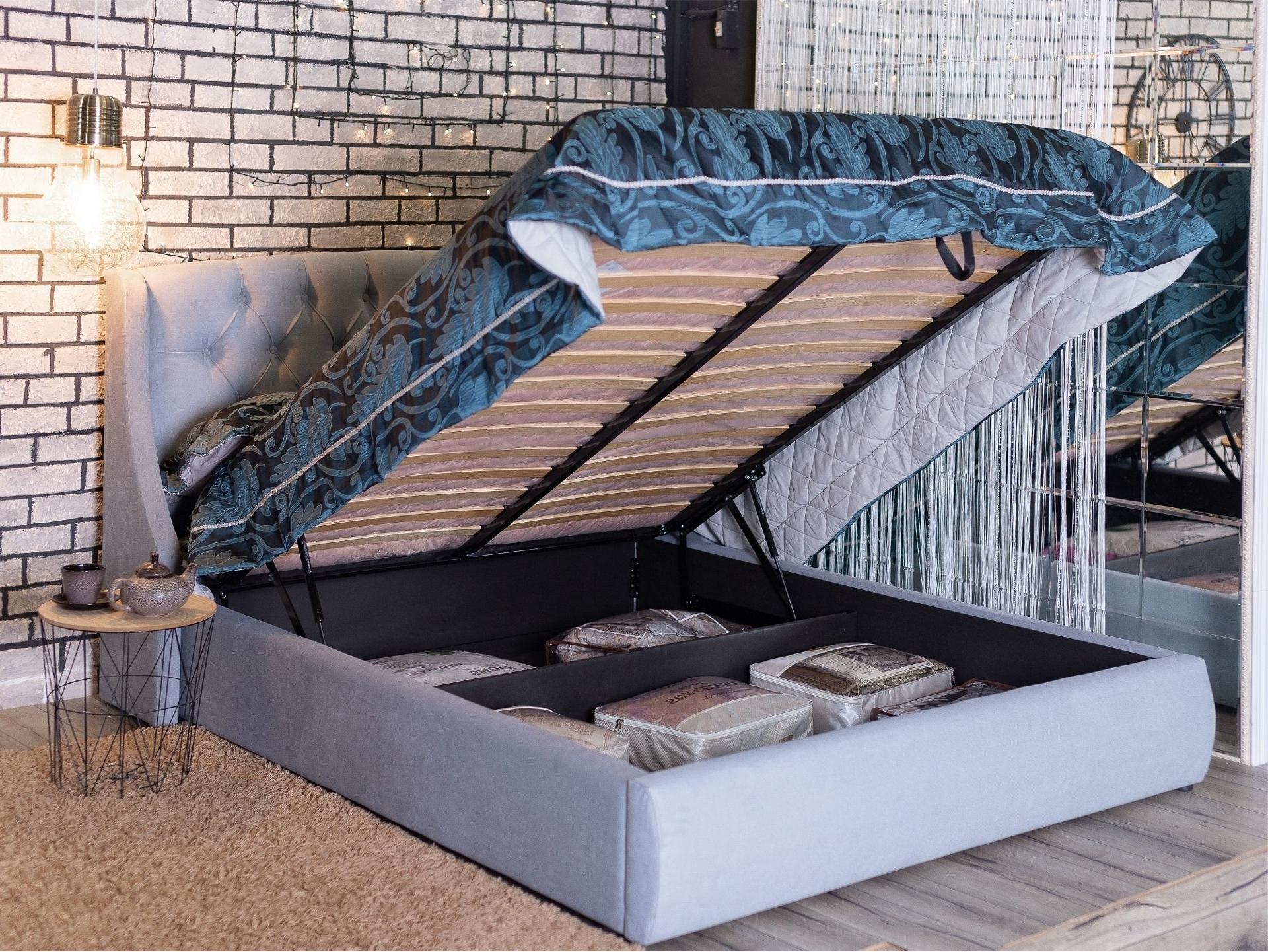 Ценители прекрасного поистине оценят мягкую интерьерную кровать Stefani из ткани с подъемным механизмом и высоким изголовьем.