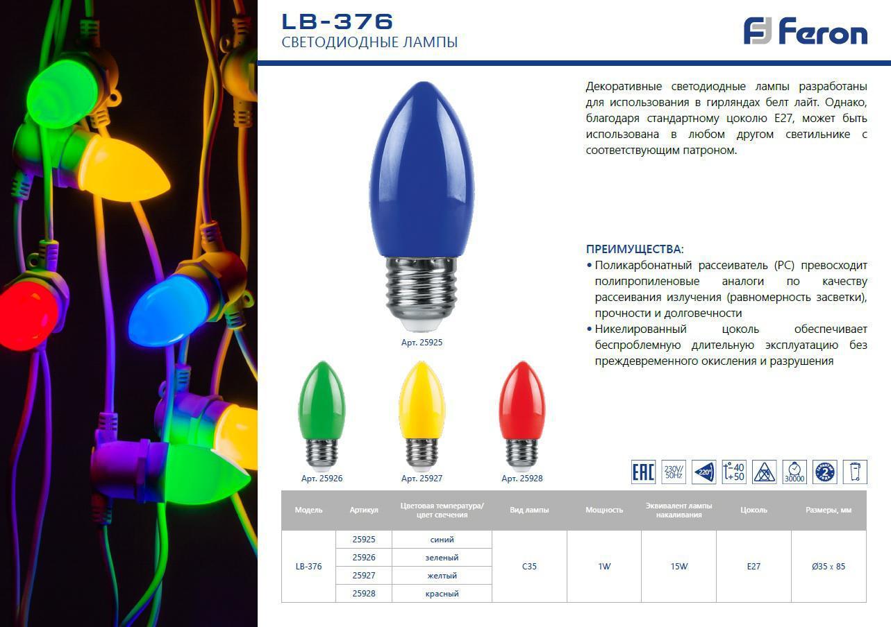 Лампа светодиодная Feron LB-376 свеча E27 1W красный