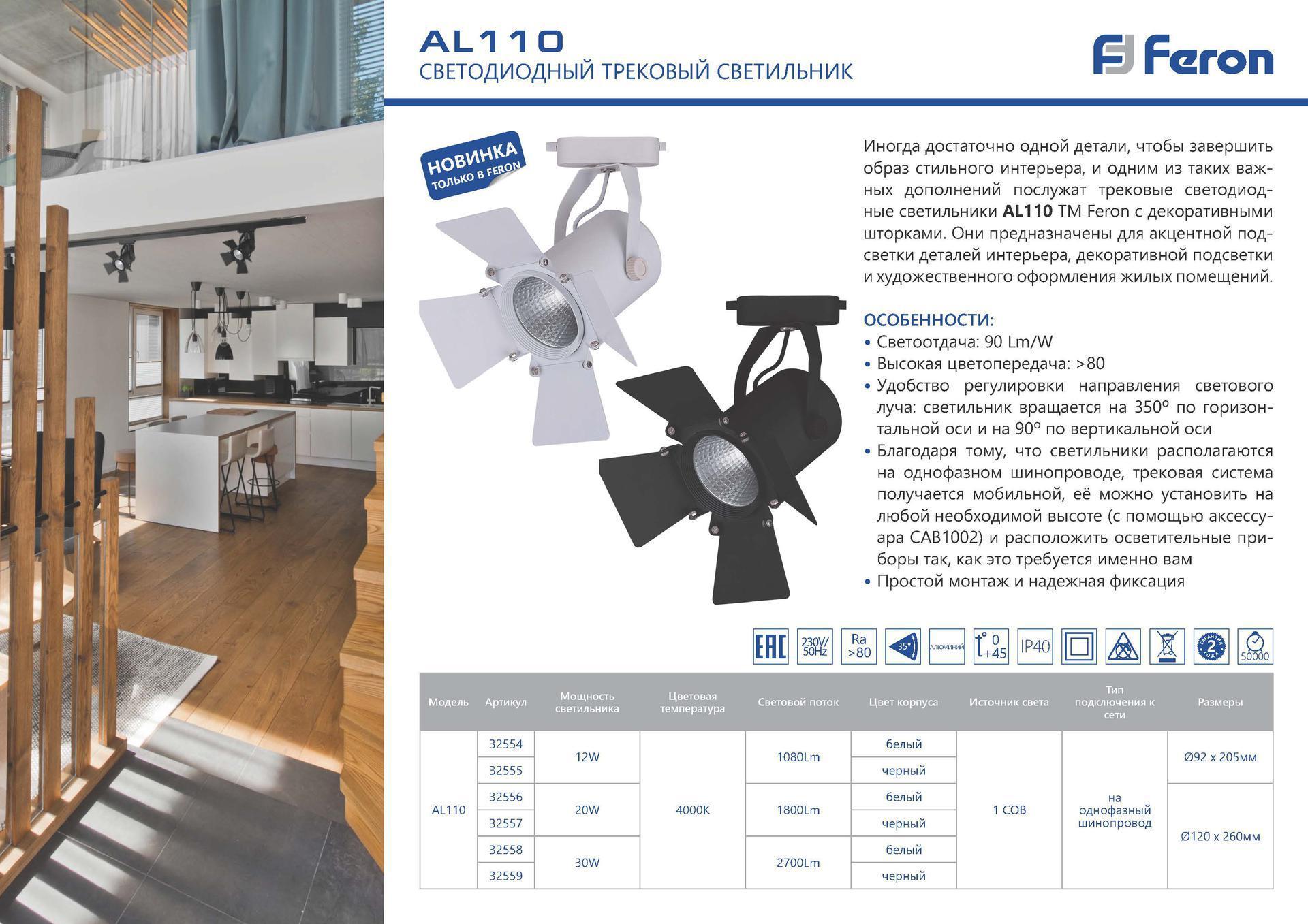 Светильник трековый светодиодный на шинопровод, однофазный (ДПО) FERON AL110, 30W, 4000К (белый), 230V, 2700Lm, угол освещения 35°, цвет черный, корпус алюминий, рассеиватель поликарбонат, вращение →350°/↓90°, 120*120*260 мм